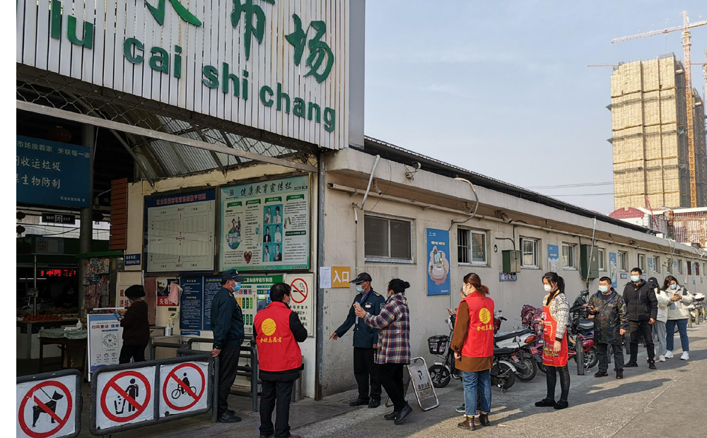 農(nóng)貿(mào)市場(chǎng)是海州區(qū)農(nóng)副產(chǎn)品的重要集散地,在疫情期間,市場(chǎng)人員密集、結(jié)構(gòu)復(fù)雜、進(jìn)出流量大,防控難度極大。為確保市場(chǎng)運(yùn)行有序、疫情防控到位,市場(chǎng)管理人員每日早早到崗,牢牢堅(jiān)守在防控一線陣地上,利用LED、口頭宣教、張貼公告等多種形式,積極宣傳新型冠狀病毒防護(hù)知識(shí),嚴(yán)格按照疫情防控要求落實(shí)測(cè)溫、掃碼、戴口罩、消毒等各項(xiàng)措施,有力保障進(jìn)場(chǎng)群眾及商戶人身安全。