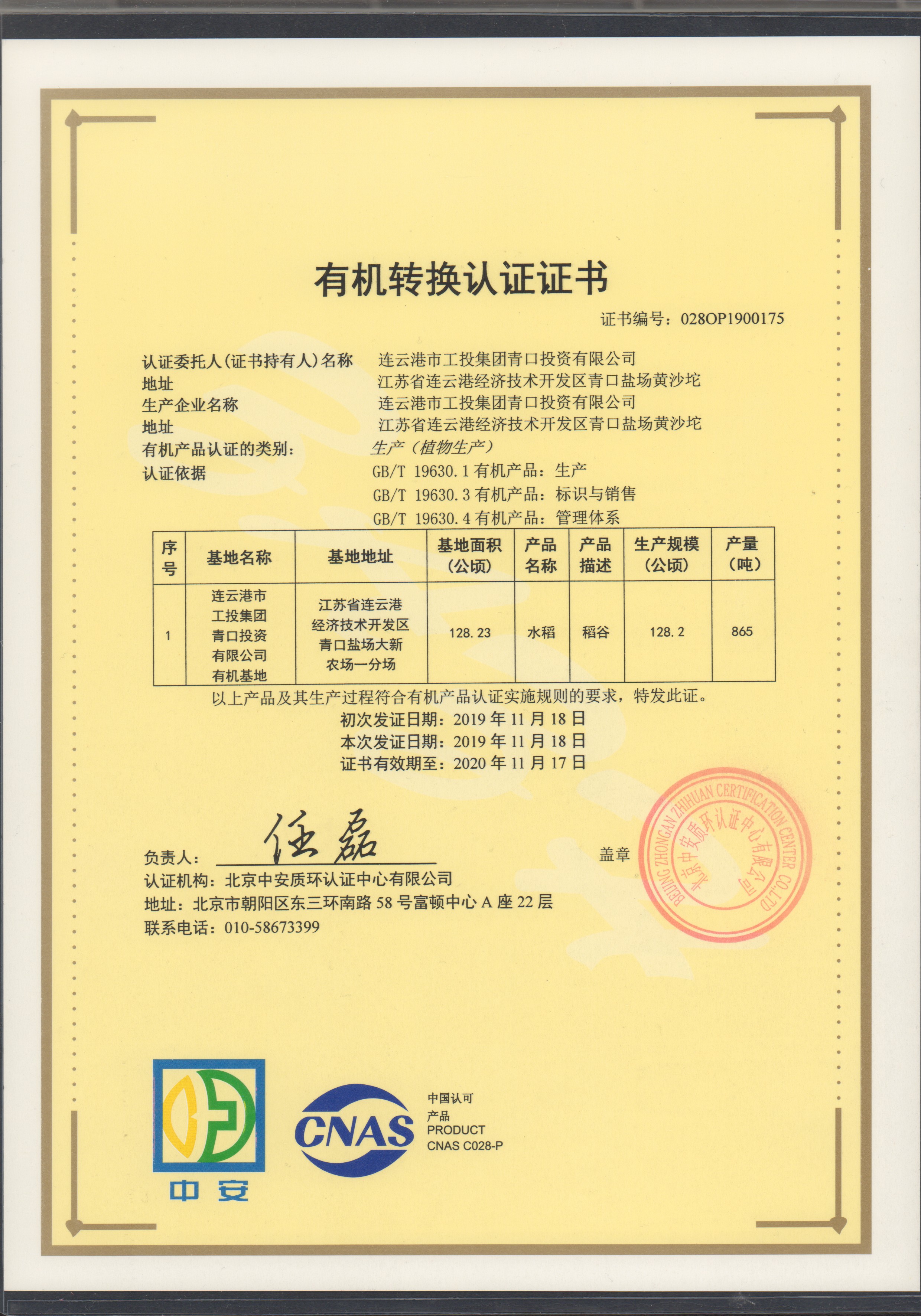 1125日上午,青口投資公司種植的“南粳9108”有機大米經(jīng)過嚴(yán)格的檢測和審核,榮獲北京中安質(zhì)環(huán)認(rèn)證中心頒發(fā)的有機轉(zhuǎn)換認(rèn)證證書。