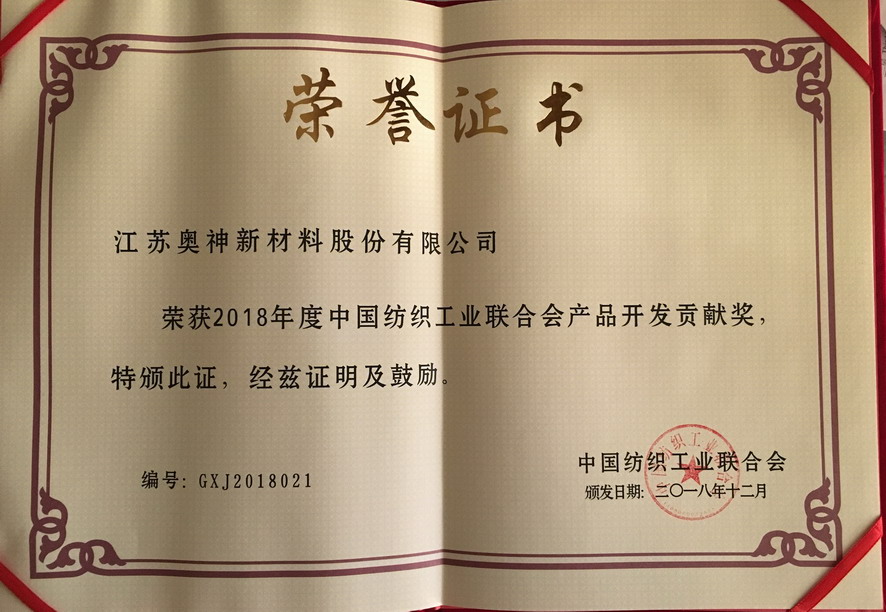 近日,在北京召開的2018年中國紡織創(chuàng)新年會(huì)上,江蘇奧神新材料股份有限公司獲得中國紡織工業(yè)聯(lián)合會(huì)頒發(fā)的“2018年度中國紡織工業(yè)聯(lián)合會(huì)產(chǎn)品開發(fā)貢獻(xiàn)獎(jiǎng)”榮譽(yù)稱號(hào)。