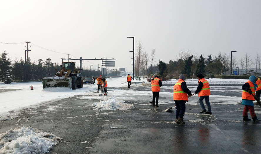 由于28日最高氣溫只有1度,路面積雪很難融化,當(dāng)天又恰逢周末,是居民大量外出的時(shí)段。為了確保人、車流高峰期間交通安全,華茂公司職工放棄周末休息,精心組織,緊密協(xié)調(diào)。從早上7點(diǎn)起,就組織工人在花果山大道、黃海大道、東方大道、新光路下穿涵洞、火車站匝道等路段撒布氯化鈣,加速積雪融化,防止路面低溫降雪產(chǎn)生冰凍,為及時(shí)掃除冰雪和確保居民正常出行提供保障。該公司組織職工近300人次,鏟車、平板車、裝載機(jī)、工程車輛等作業(yè)機(jī)械十余臺(班)投入到掃除積雪工作中去,使用氯化鈣十余噸。截止28日下午4時(shí),經(jīng)過近一天的緊張作業(yè),各條主干道積雪基本清理完畢,道路恢復(fù)通暢。