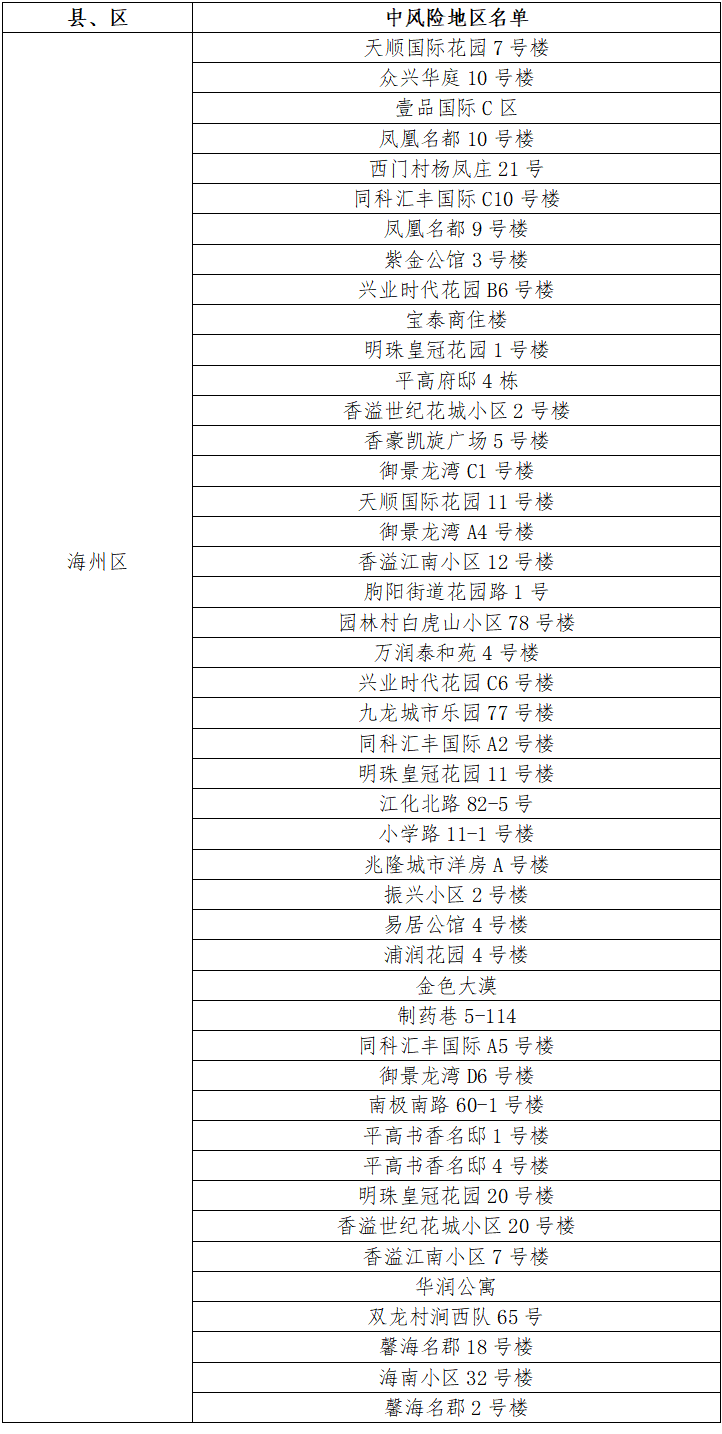 海州區(qū)中央華府D1棟、玉蘭國(guó)際5號(hào)樓、福園名邸3號(hào)樓、一品苑44號(hào)樓、博威江南明珠苑33號(hào)樓、如佳賓館(霞輝路店)、鳳祥銘居7號(hào)樓、蒼梧春曉23號(hào)樓、龍河小區(qū)25號(hào)樓、鷹游水岸花園5號(hào)樓、海南小區(qū)34號(hào)樓、仕方國(guó)際9號(hào)樓、茗馨花園18號(hào)樓、梧桐藍(lán)山晴園7號(hào)樓、富強(qiáng)路疏導(dǎo)點(diǎn)旁三合院、百達(dá)菲力酒吧、通灌南路66號(hào)3棟、極美公寓4號(hào)樓、路南街道河運(yùn)路35號(hào)樓、海連中路151號(hào)、興城四號(hào)公寓8號(hào)樓、青年路55號(hào)5棟、東方領(lǐng)秀7號(hào)樓、寶翔財(cái)富廣場(chǎng)3號(hào)樓、園林村白虎山組王莊隊(duì)13號(hào)、津華苑小區(qū)A2號(hào)樓、盛世豪庭小區(qū)8號(hào)樓、許莊村楊圩北隊(duì)51號(hào)、振興公寓6號(hào)樓、建欣路1號(hào)樓、園林村白虎山小區(qū)100號(hào)、路南街道東村巷2號(hào)樓、建設(shè)中路76-24號(hào)由中風(fēng)險(xiǎn)地區(qū)調(diào)整為低風(fēng)險(xiǎn)地區(qū)。