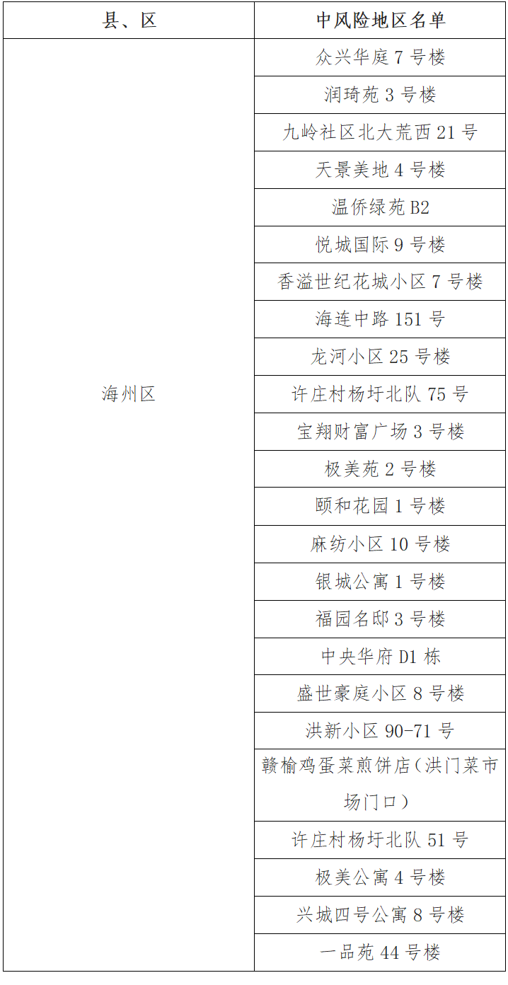 根據(jù)國務(wù)院聯(lián)防聯(lián)控機制有關(guān)規(guī)定,經(jīng)綜合評估研判,市指揮部決定,自發(fā)布之日起,將頤和花園1號樓、麻紡小區(qū)10號樓、銀城公寓1號樓、福園名邸3號樓、中央華府D1棟、盛世豪庭小區(qū)8號樓、洪新小區(qū)90-71號、贛榆雞蛋菜煎餅店(洪門菜市場門口)、許莊村楊圩北隊51號、極美公寓4號樓、興城四號公寓8號樓、一品苑44號樓調(diào)整為中風(fēng)險地區(qū)。其他地區(qū)風(fēng)險等級不變。調(diào)整后全市現(xiàn)有24個中風(fēng)險地區(qū)。