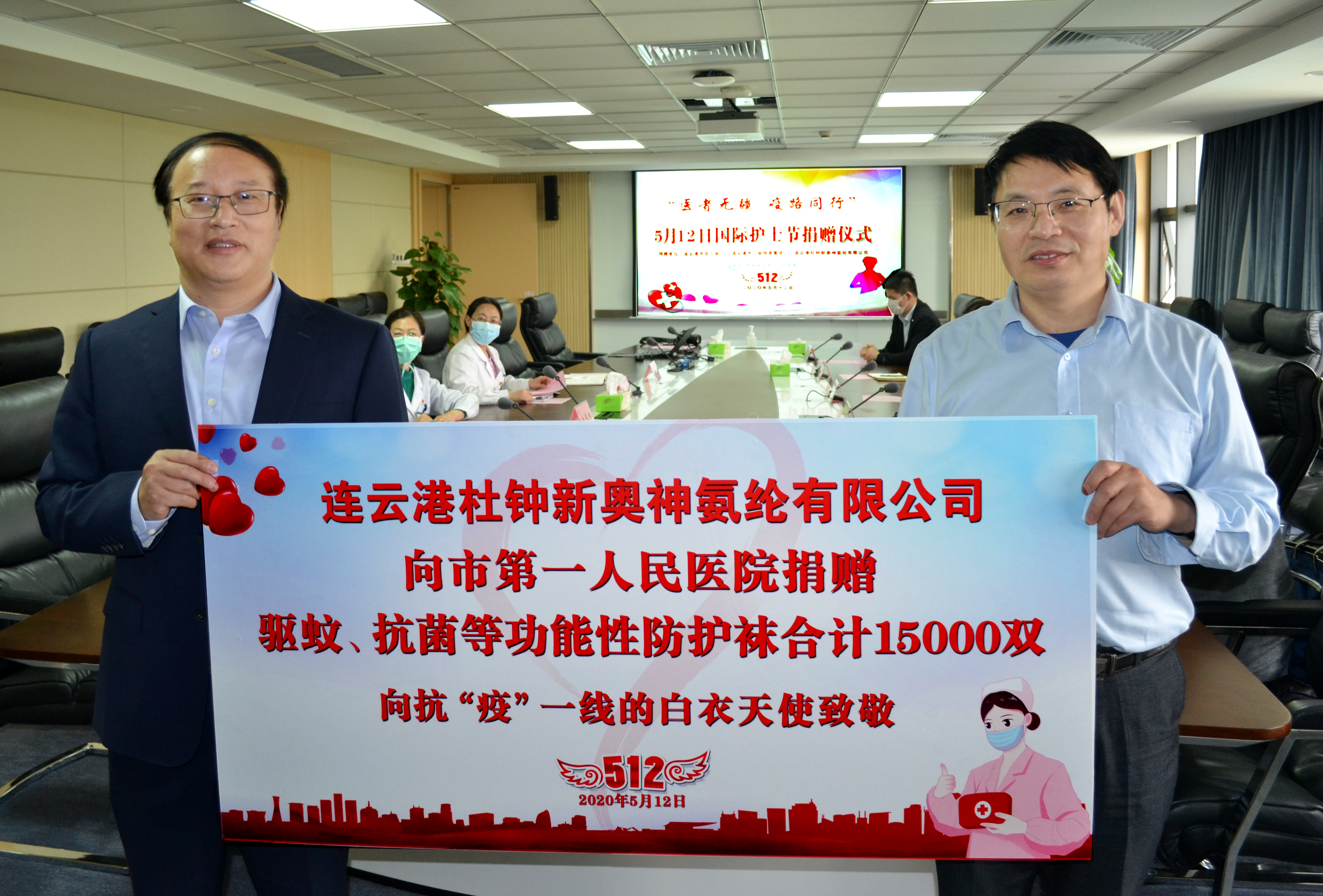 5月12日國際護(hù)士節(jié),連云港杜鐘氨綸有限公司來到連云港市第一人民醫(yī)院開展愛心捐贈(zèng)活動(dòng),共計(jì)捐贈(zèng)功能性絲襪15000雙。市總工會(huì)副主席秦云、集團(tuán)工會(huì)主席劉承志、市一醫(yī)工會(huì)主席胡蓉,副院長李明星,氨綸公司總經(jīng)理張斌出席捐贈(zèng)儀式。