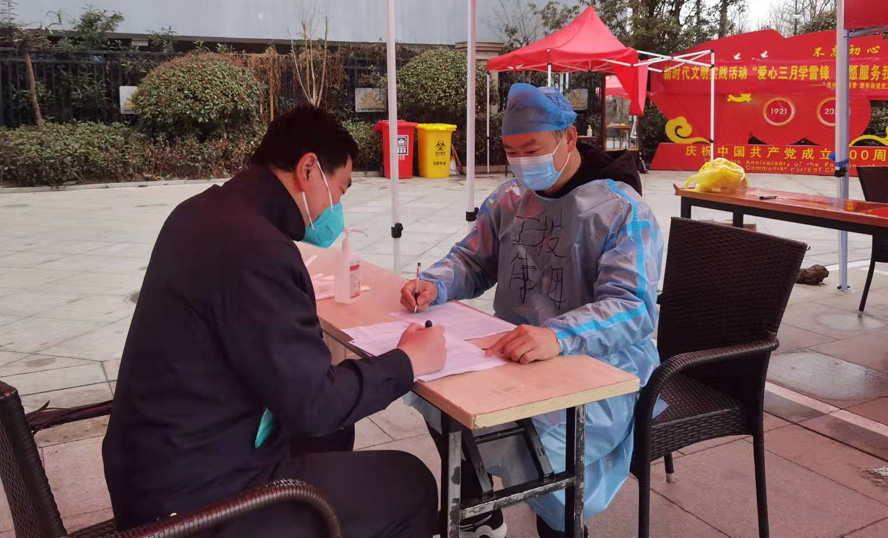 核酸采樣檢測(cè)高效完成。“居民們請(qǐng)注意,咱們小區(qū)黃碼檢測(cè)點(diǎn)啟用了,請(qǐng)健康碼為黃碼的居民到這邊排隊(duì),請(qǐng)大家佩戴口罩,有序排隊(duì)檢測(cè)?!薄敖鸱孔印敝驹刚吣弥群暗?。由于該小區(qū)部分樓棟被列為中風(fēng)險(xiǎn)區(qū)域,部分居民健康碼轉(zhuǎn)為了黃碼,為此,志愿者小分隊(duì)協(xié)助社區(qū)開設(shè)了健康碼“黃碼”人員核酸檢測(cè)專用采樣點(diǎn),解決健康碼“黃碼”人員核酸檢測(cè)難的問題。他們從早上7點(diǎn)鐘開始一直堅(jiān)守在核酸檢測(cè)一線,直到下午5點(diǎn)多鐘,終于結(jié)束了一天的志愿服務(wù)工作,脫下了防護(hù)服“戰(zhàn)袍”,肚子“咕咕”地鬧了起來,這才想起竟十幾個(gè)小時(shí)沒有喝水、吃飯、上廁所了。