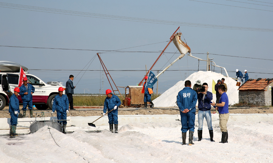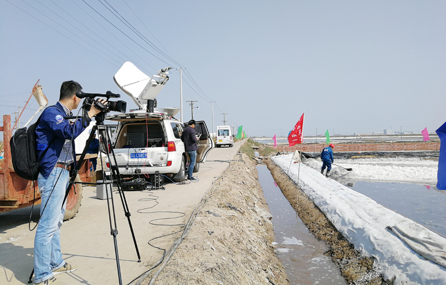 攝制組動(dòng)用直播車(chē)、航拍、信號(hào)傳輸+高清攝像機(jī)等設(shè)備,工作人員各有分工,同步拍攝鹽田生產(chǎn)、鹽工勞動(dòng)以及食鹽生產(chǎn)等淮鹽收獲的喜人畫(huà)面,記者更是在鏡頭的一路跟拍下,一邊自己動(dòng)手操作,一邊與現(xiàn)場(chǎng)勞動(dòng)的鹽工親切交談,向觀(guān)眾詳細(xì)解讀生態(tài)淮鹽灘曬生產(chǎn)和食鹽生產(chǎn)的工藝流程,為大家熟悉、了解和保護(hù)淮鹽提供一次直觀(guān)的認(rèn)知機(jī)會(huì)。