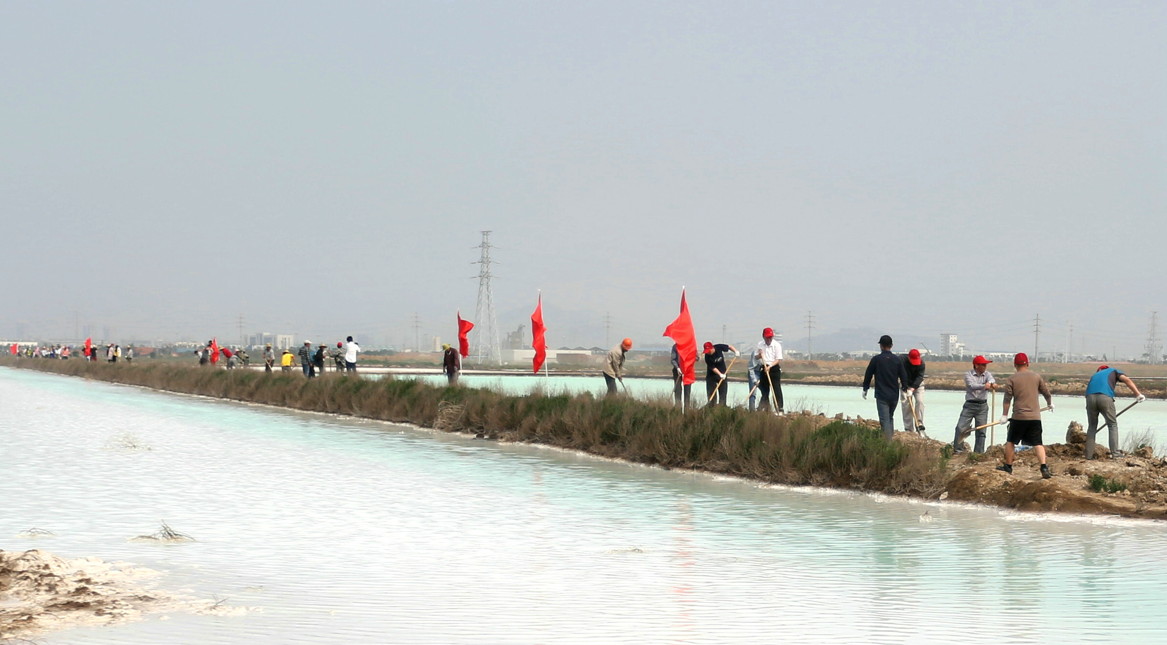 6月13日下午,來(lái)自公司機(jī)關(guān)第一、第二黨支部及臨達(dá)公司、海州灣公司、金臺(tái)公司、海濱工區(qū)等六個(gè)黨支部的百余名黨員志愿者,自行解決交通工具和勞動(dòng)工具,頂著炎炎烈日,齊聚242省道北側(cè)1公里處的臨達(dá)公司新建鈣液輸送管道現(xiàn)場(chǎng),“一”字型排開(kāi),在近600米的溝堰上展開(kāi)管道鋪設(shè)溝道回填土工程,場(chǎng)面蔚為壯觀。