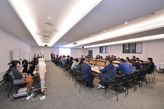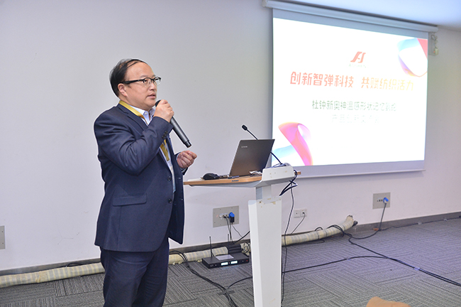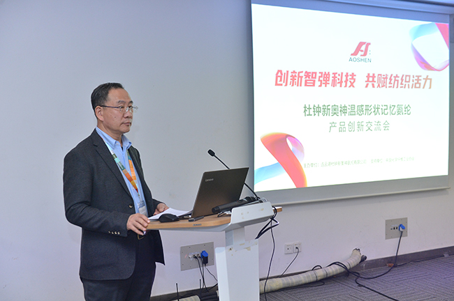 交流會上,杜鐘氨綸研發(fā)部曾登部長就奧神溫感形狀記憶氨綸的開發(fā)背景、產(chǎn)品特性以及應用前景作了深入解析。參會嘉賓在對溫感形狀記憶氨綸有了較為清晰的認知和了解后,圍繞該產(chǎn)品的功能特點并結(jié)合自身產(chǎn)品開發(fā)方向,展開了一場智慧碰撞,對溫感形狀記憶氨綸的創(chuàng)新應用提出了獨到的建議和暢想。