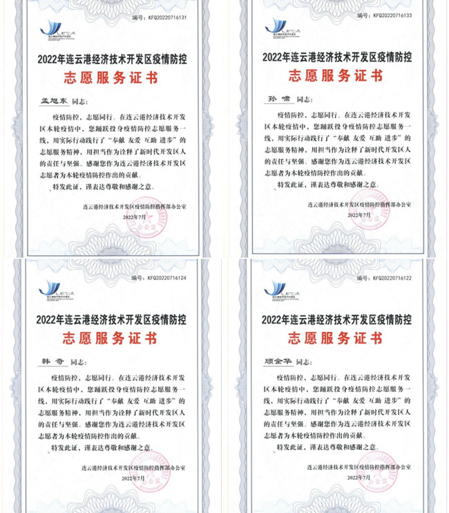 杜鐘氨綸公司疫情防控志愿者獲頒榮譽(yù)證書