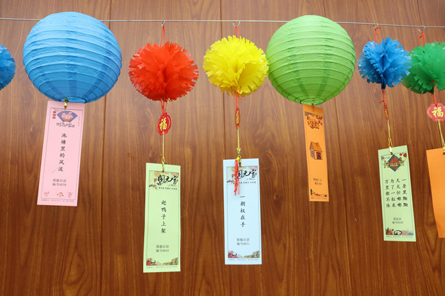 燈謎活動(dòng)現(xiàn)場,燈籠和彩旗下懸掛著五顏六色百余個(gè)謎面,洋溢著濃濃的節(jié)日氣氛。燈謎內(nèi)容涉及冬奧會、傳統(tǒng)知識、生活常識、歇后語等方面,既具趣味性,又具知識性。