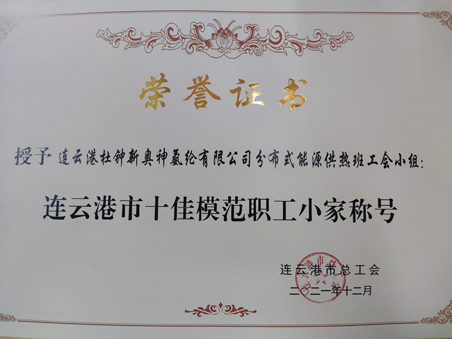 杜鐘氨綸公司分布式能源供熱班工會小組榮獲市“十佳模范職工小家”稱號