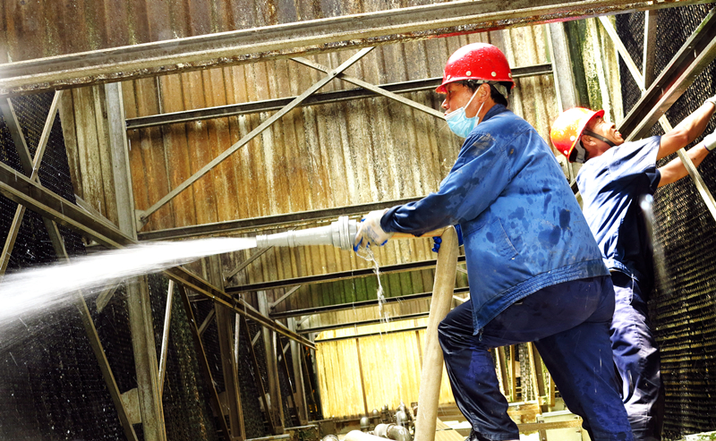 近期,最高氣溫達(dá)到了36℃!公用工程部一直密切關(guān)注近一周的天氣預(yù)報,利用連續(xù)高溫天氣回調(diào)之際,迅速組織相關(guān)清洗人員,利用一天時間緊急清洗八期冷卻塔,將附著在填料上藻狀和絮狀物及塔底淤泥等徹底清理干凈,從而保證冷卻塔通風(fēng)量,使八期動力設(shè)備得以在高溫環(huán)境下安全運(yùn)行,接受“烤驗”。