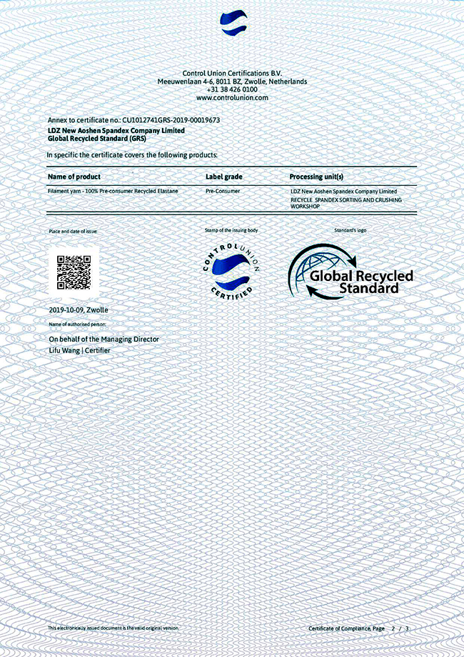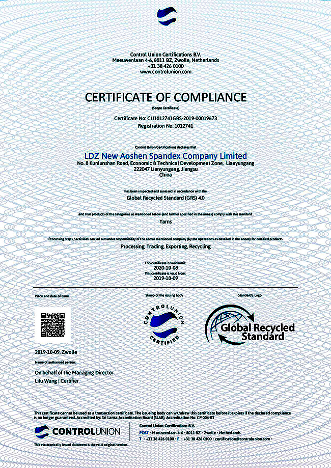 2019109日,連云港杜鐘新奧神氨綸有限公司通過全球回收標準認證,取得GRS證書,即獲得對再生氨綸纖維生產(chǎn)的資質(zhì),可根據(jù)客戶需要提供貿(mào)易證書(TC)和全球認可的GRS吊牌。