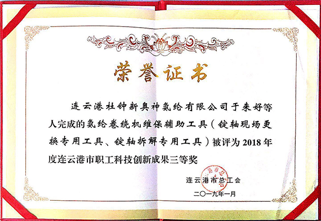 氨綸公司生產(chǎn)設(shè)備部卷繞機(jī)維修班組于來好同志發(fā)明的氨綸卷繞機(jī)維保輔助工具(其中錠軸現(xiàn)場(chǎng)更換專用工具和錠軸拆解專用工具)被市總工會(huì)評(píng)為“2018年度連云港職工科技創(chuàng)新成果三等獎(jiǎng)。”