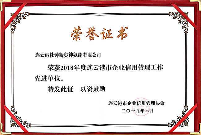 3月21日,在全市企業(yè)信用管理工作表彰大會上氨綸公司被連云港市企業(yè)信用管理協(xié)會表彰為“2018年度連云港市企業(yè)信用管理工作先進(jìn)單位”。會上,共有33家優(yōu)秀企業(yè)獲此殊榮。