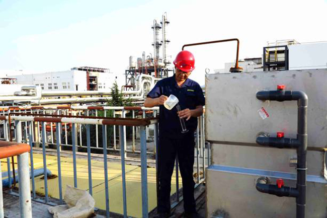 一直以來,公司秉承“綠色發(fā)展”的理念,在具體操作中采用“掐頭截尾”法進(jìn)行污水排放綜合治理。“掐頭”即要求各責(zé)任部門強力監(jiān)督治理源頭,實施廢液進(jìn)行循環(huán)利用,對違規(guī)部門要求限期整改,情節(jié)嚴(yán)重的追究相關(guān)責(zé)任人責(zé)任。“截尾”即抓污水處理工藝提升優(yōu)化,保證污水處理設(shè)備正常運行和污水處理質(zhì)量,不達(dá)標(biāo)堅決不排放。與此同時,主動邀請環(huán)保部門和第三方權(quán)威機構(gòu)對現(xiàn)有污水處理設(shè)備提供環(huán)保法規(guī)指導(dǎo)和技術(shù)支持,水樣檢測實現(xiàn)在線檢測,并與環(huán)保監(jiān)控平臺聯(lián)網(wǎng),確保工業(yè)污水達(dá)標(biāo)排放。