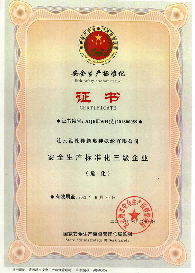 經(jīng)企業(yè)自評(píng)、縣區(qū)安監(jiān)局初審、市安監(jiān)局形式審查、考評(píng)機(jī)構(gòu)考評(píng)、市局抽查頒證等程序,最終氨綸公司順利通過評(píng)審,取得了安全生產(chǎn)標(biāo)準(zhǔn)化三級(jí)企業(yè)(?;┳C書。