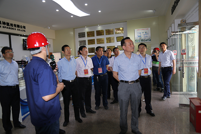 2017年5月25日,由市人大常委會(huì)領(lǐng)導(dǎo)陳敏帶隊(duì),省市縣三級(jí)人大代表組成的視察組一行25人,在工投集團(tuán)董事長(zhǎng)楊龍、總經(jīng)濟(jì)師陳如軍等陪同下赴我公司參觀考察,代表團(tuán)先后參觀我了公司展廳、工程建設(shè)現(xiàn)場(chǎng)及7期項(xiàng)目生產(chǎn)線,氨綸公司總經(jīng)理張斌進(jìn)行了情況介紹。