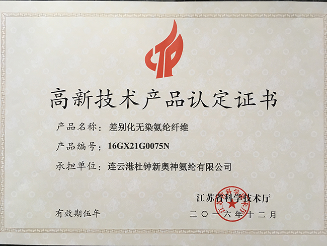 近日,我公司“差別化無染氨綸”喜獲江蘇省2016年高新技術(shù)產(chǎn)品認(rèn)定。