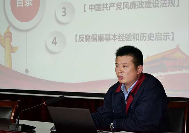 11月6日下午,杜鐘氨綸公司開展廉政黨課教育活動,黨委委員、紀委書記劉殿龍以《黨風廉政建設(shè)永遠在路上》為題,為公司黨員干部、全體管理人員上了一堂廉政黨課。