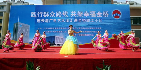 為了貫徹黨的群眾路線教育實踐活動精神,豐富基層職工的精神文化生活。628日上午,由連云港廣電傳媒集團和集團公司共同主辦的“踐行群眾路線,共架幸福金橋”連云港廣電藝術(shù)團走進鹽場職工小區(qū)文藝演出在猴嘴昌圩湖社區(qū)拉開帷幕。廣電傳媒集團領(lǐng)導(dǎo)戴詠寒、馬富勝、萬自力,集團公司領(lǐng)導(dǎo)顧永庚、鄭宜虎、戴鴻鳴與數(shù)百名鹽場職工群眾歡聚昌圩,共同欣賞來自連云港廣電新聞綜合頻道的主持人和編輯記者與金橋職工自編自演的精彩節(jié)目。