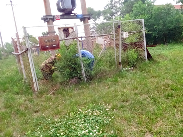 清理外置的變電設(shè)備周圍環(huán)境。通過(guò)夏季雨水的滋潤(rùn),外置的變電設(shè)備周圍長(zhǎng)滿了鹽蒿、蔓草和蘆葦。有的地方雜草叢生人不能進(jìn)入給維護(hù)造成困難,有的地方蔓草越過(guò)圍欄直接爬上電桿威脅線路安全,有的直接被淹沒在蘆葦叢中,不見了蹤影,給變電設(shè)備的環(huán)境帶來(lái)惡化和安全隱患。為此,供電所組織人員進(jìn)行全面清理,完成了16處外置的變電設(shè)備清理工作。