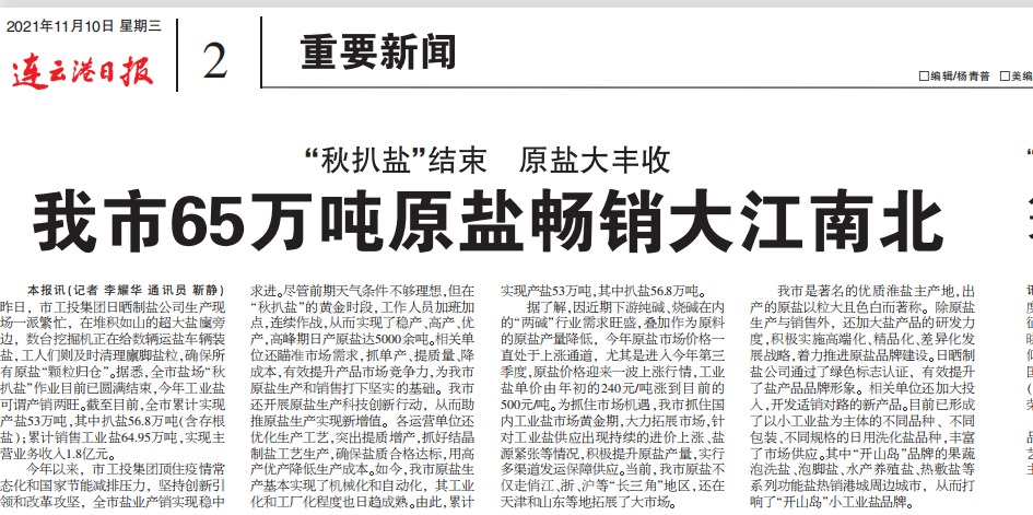 連云港日?qǐng)?bào)刊登:我市65萬(wàn)噸原鹽暢銷(xiāo)大江南北
