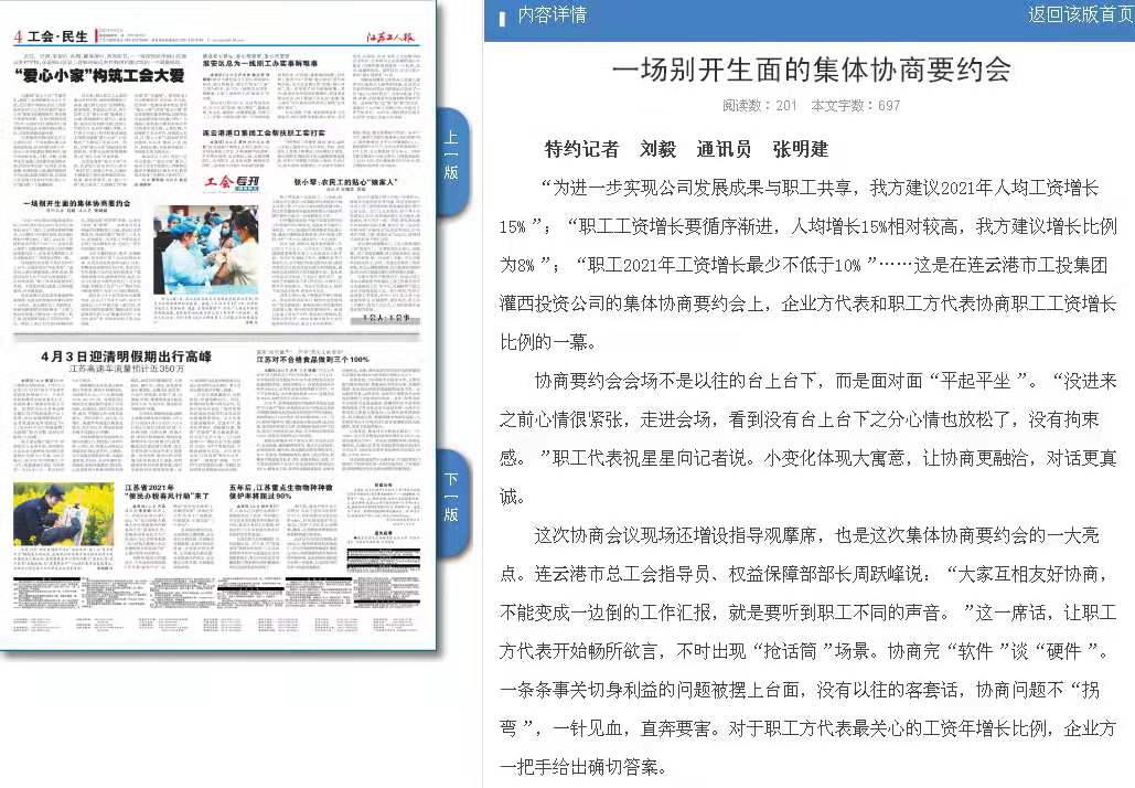 “為進(jìn)一步實(shí)現(xiàn)公司發(fā)展成果與職工共享,我方建議2021年人均工資增長(zhǎng)15%”;“職工工資增長(zhǎng)要循序漸進(jìn),人均增長(zhǎng)15%相對(duì)較高,我方建議增長(zhǎng)比例為8%”;“職工2021年工資增長(zhǎng)最少不低于10%”……這是在連云港市工投集團(tuán)灌西投資公司的集體協(xié)商要約會(huì)上,企業(yè)方代表和職工方代表協(xié)商職工工資增長(zhǎng)比例的一幕。