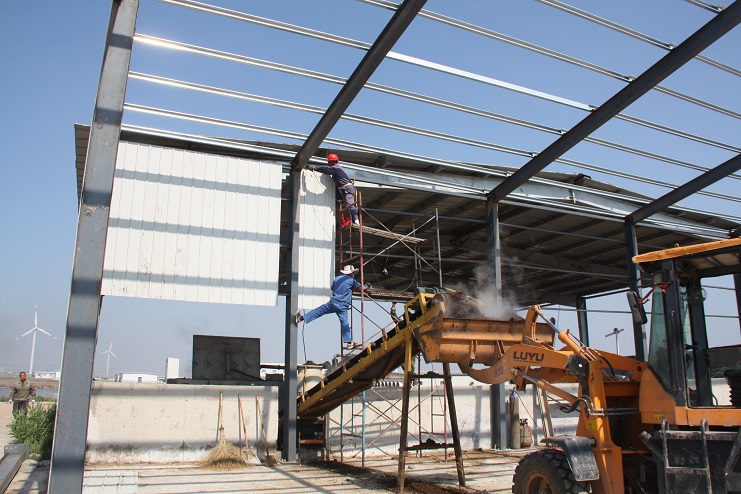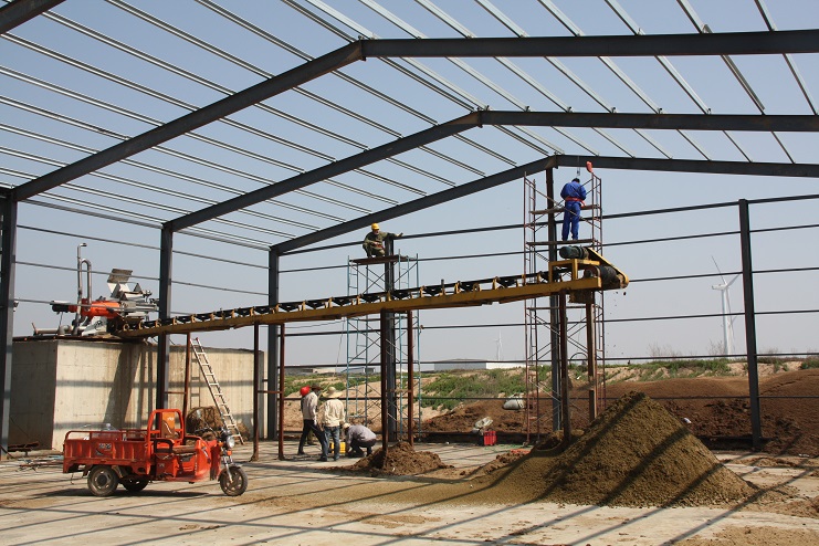 5月18日,位于北北歐農(nóng)莊生豬養(yǎng)殖廠旁邊的綠淮肥業(yè)公司有機(jī)肥生產(chǎn)基地,一個(gè)鋼結(jié)構(gòu)廠房即將完工,只見機(jī)聲轟鳴、焊花飛濺,機(jī)電服務(wù)公司的工人在勞模王緒華帶領(lǐng)下正在焊接鋼結(jié)構(gòu)件,而正在建設(shè)施工中的廠房內(nèi),兩條有機(jī)肥生產(chǎn)線運(yùn)轉(zhuǎn)不停,沒有因廠房建設(shè)而停產(chǎn),廠房旁邊的一臺(tái)挖掘機(jī)正在整平場地,一邊建設(shè),不邊生產(chǎn),一派紅火景象。