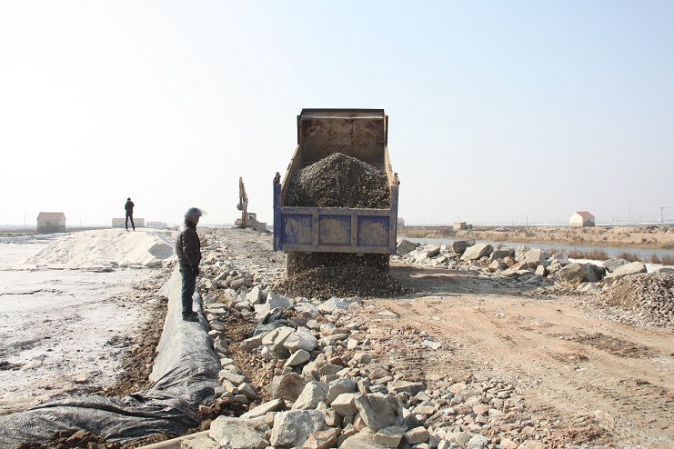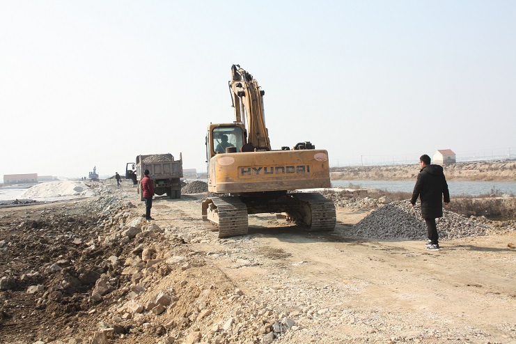2月15日,在新河制鹽公司七至十班運鹽路施工現(xiàn)場,我們看到南翼公司項目工程分公司的員工正在指揮兩臺小型工程車將石子傾倒在路基上,兩臺挖掘機正忙于將運送來的石子整平。運鹽河對面,三輛滿載土夾石的大型工程車一字排開,正等待卸載。據(jù)了解,目前正在施工的是新河制鹽分公司二期運鹽路維修改造工程,該工程改造路段全長3300米,計劃總投資193萬元,其中路基鋪設(shè)部分由日曬制鹽公司出資45萬元,路面部分則由縣交通局承擔(dān),預(yù)計需要投入148萬元。該工程于去年底開始施工,預(yù)計三月中下旬全部鋪設(shè)完成。另外新河制鹽分公司一期一至十二班3300米運鹽路改造工程計劃將于今年下半年實施。