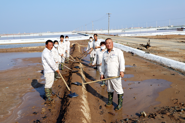 趁著休息的間隙,筆者與身邊忙得滿頭大汗的8班班長祝星星聊了起來。據(jù)祝星星介紹,每天員工4點(diǎn)半就到灘頭,進(jìn)行鹽池的人工活碴、稟基修復(fù)、鹽池鹵水補(bǔ)充、收放設(shè)備檢查等一系列工作,因此,合理安排工作量非常重要。他告訴筆者,室外工作工人的勞保服比較厚,一天下來工作服濕了又干,干了又濕,衣服上都泛出厚厚的鹽漬。一天下來,全班要消耗2大桶甚至更多的飲用水?,F(xiàn)在公司里對我們一線生產(chǎn)崗位員工非常關(guān)心,防暑降溫工作非常到位。最近,單位又為我們發(fā)放高溫津貼、電風(fēng)扇、防暑降溫藥品。這些讓我們員工真切感受到組織的力量,組織得偉大,所以雖說現(xiàn)在比平時(shí)更辛苦,我們有信心戰(zhàn)高溫、奪高產(chǎn)。