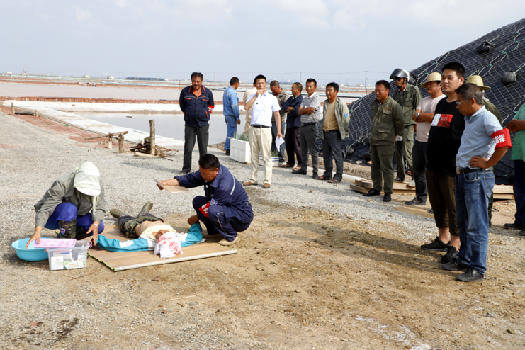 當(dāng)天下午正直高溫天氣,室外環(huán)境悶熱。現(xiàn)場(chǎng),鹽工孫良成在烈日下工作幾個(gè)小時(shí)后早已汗流浹背,堅(jiān)持工作一段時(shí)間后,感到頭暈?zāi)垦?,支持不住倒在了鹽池邊上。現(xiàn)場(chǎng)安全員張軍連第一時(shí)間趕到現(xiàn)場(chǎng),根據(jù)經(jīng)驗(yàn),初步判斷倒地者出現(xiàn)了中暑癥狀。立即組織員工董志波和曹軍華將孫良成抬至陰涼通風(fēng)處,側(cè)臥后仰頭部,保持其呼吸暢通。并解開(kāi)他身上的衣扣,一邊為他扇風(fēng)送涼。大伙一邊用溫濕毛巾不斷為他擦拭身體降溫,一邊喂他服下藿香正氣水,并用清涼油、風(fēng)油精等擦拭額頭位置。在現(xiàn)場(chǎng)急救迅速開(kāi)展的同時(shí),班長(zhǎng)林樹(shù)軍立即向埒南分公司安全負(fù)責(zé)人江躍匯報(bào),江躍到達(dá)現(xiàn)場(chǎng)了解情況并通知公司經(jīng)理?xiàng)钍乇螅瑫r(shí)通知120急救中心,幾分鐘后,120急救人員趕到現(xiàn)場(chǎng),并對(duì)中暑人員進(jìn)行施救,經(jīng)過(guò)緊張有序的急救,患者逐漸蘇醒并初步恢復(fù)神智,抬上救護(hù)車(chē)送去醫(yī)院,至此演練結(jié)束。