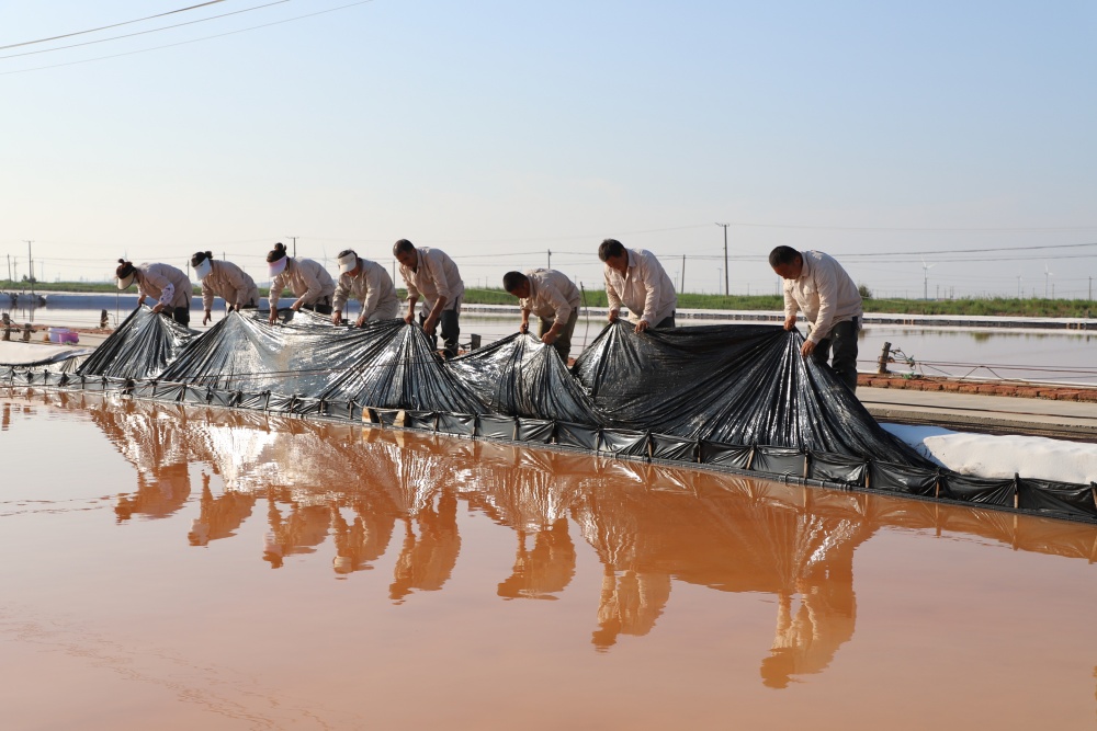 在破曉時分,日曬制鹽的萬畝鹽田被一輪旭日染上了一層金色的光輝,仿佛一夜之間,這片鹽堿地被冰封的魔力所籠罩,呈現(xiàn)出一種寧靜而又深邃的景象。凌晨4點半,那些勤勞的鹽灘工人早已熱火朝天地忙著活碴、修補(bǔ)塑布、加固浮板等保鹽保鹵工作。省勞模祝星星在巡灘時說道:“現(xiàn)在正處梅雨季節(jié),我們戰(zhàn)高溫、搶天,在做好原鹽生產(chǎn)的基礎(chǔ)上,更要統(tǒng)籌做好抗災(zāi)工程,確保安穩(wěn)度汛。當(dāng)然,我們對今年超額完成生產(chǎn)指標(biāo)任務(wù)充滿信心。”這番話無疑是對他們辛勤勞作的一種樂觀詮釋。