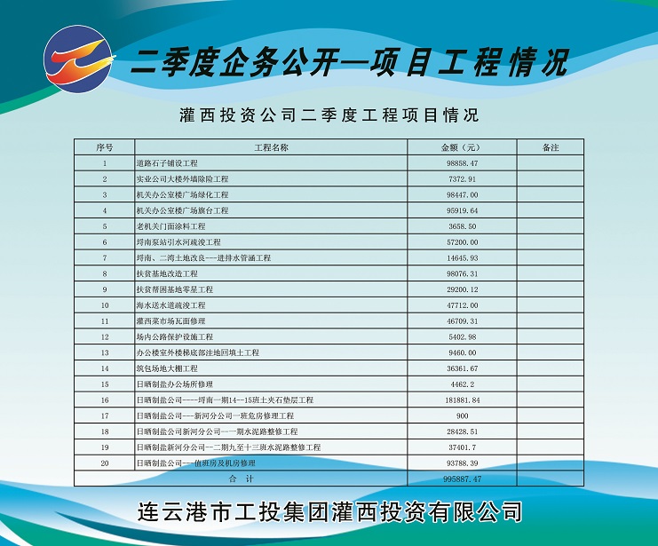 道路石子鋪設(shè)工程98858.47元;實(shí)業(yè)公司大樓外墻除險(xiǎn)工程7372.91元;機(jī)關(guān)辦公樓廣場綠化工程98447.00元;機(jī)關(guān)辦公室樓廣場旗臺工程95919.64元;老機(jī)關(guān)門面涂料工程3658.50元;埒南泵站引水河疏浚工程57200.00元;埒南、二灣 土地改良—進(jìn)排水管涵工程14645.93元;扶貧基地改造工程98076.31元;扶貧幫困基地零星工程29200.12元;海水送水道疏浚工程47712.00元;灌西菜市場瓦面修理46709.31元;場內(nèi)公路保護(hù)設(shè)施工程5402.98元;辦公樓室外樓梯底部洼地回填土工程9460元;筑包場地大棚工程36361.67元;日曬制鹽辦公場所修理4462.2元;日曬制鹽公司---埒南一期14—15班土夾石墊層工程181881.84元;日曬制鹽公司---新河分公司一班危房修理工程900元;日曬制鹽公司新河分公司—一期水泥路整修工程 28428.51元;日曬制鹽新河分公司一二期九至十三班水泥路整修工程37401.7元;日曬制鹽公司---值班房及機(jī)房修理93788.39元