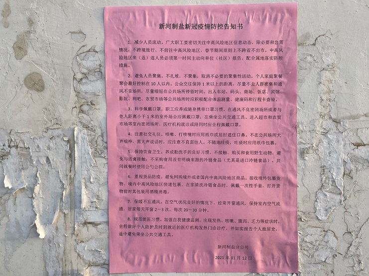春節(jié)臨近,人員流動增加,根據(jù)灌西投資公司疫情防控工作的需要,結合冬春季疫情形勢,為切實加強生產(chǎn)一線疫情防控工作 ,進一步防范疫情輸入,提高職工自我防護意識,新河制鹽分公司1月12日在公司醒目位置張貼《疫情防控告知書》,并對各個班組發(fā)放《疫情防控告知書》,每位員工簽字并存檔。
