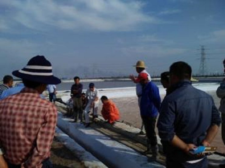 該分公司一班人帶著十六名班長,到新河零班做加鹵“天溝”工作現(xiàn)場(chǎng)。剛到目的地,站在打好的溝頭,一眼望去,二條溝口線筆直,和熟捯實(shí)的粘埝泥輕而易舉承載著人的重量。此條加鹵“天溝”嚴(yán)格按日曬制鹽公司規(guī)格標(biāo)準(zhǔn)而建,溝長約210米,上口寬55cm,下口寬30cm,溝深45cm,溝底坡勢(shì)順沿三排到頭排由淺至深。做好的一條加鹵溝, 可以為六塊結(jié)晶池扒鹽期間分別添加鹵水,減少洗鹽鹵水進(jìn)其它池塊的二次污染。