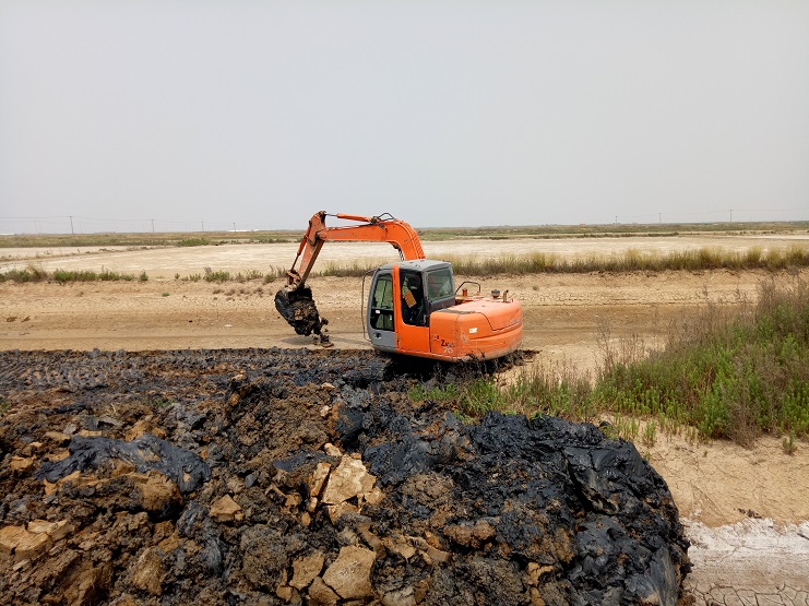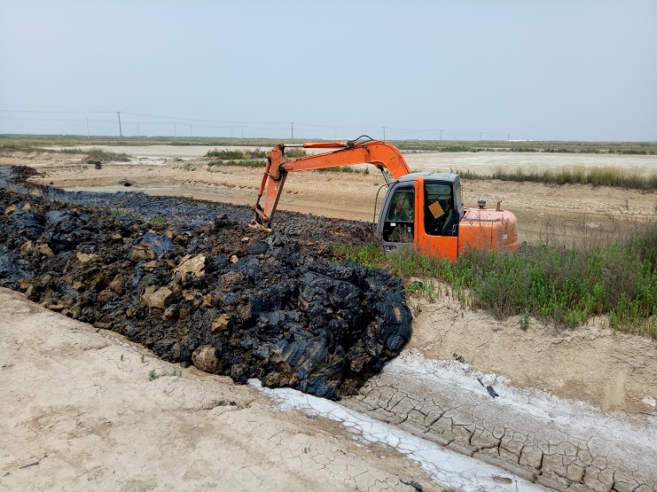 海鹽基地一班班組近日對(duì)土塘進(jìn)行清淤改造。兩臺(tái)挖掘機(jī)頂著連日來(lái)的高溫天氣連續(xù)工作。現(xiàn)該班班組的三排土塘清淤改造工作基本完成。(實(shí)業(yè)公司)