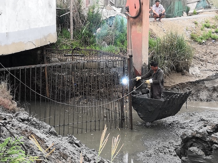 由于小站河道長期未清理,淤泥和廢棄物的堆積,對小站機泵打水造成阻礙,降低了機泵打水速度,造成耗時增長、耗電量增加,嚴(yán)重影響了小站閘工的工作效率。因此資源公司動用兩臺挖掘機對小站河道進行了扒淤和廢棄物清理工作,并增設(shè)自制潮檔阻擋廢棄物進入機泵附近,防止廢棄物纏上機泵的水葉,對機泵造成損傷。