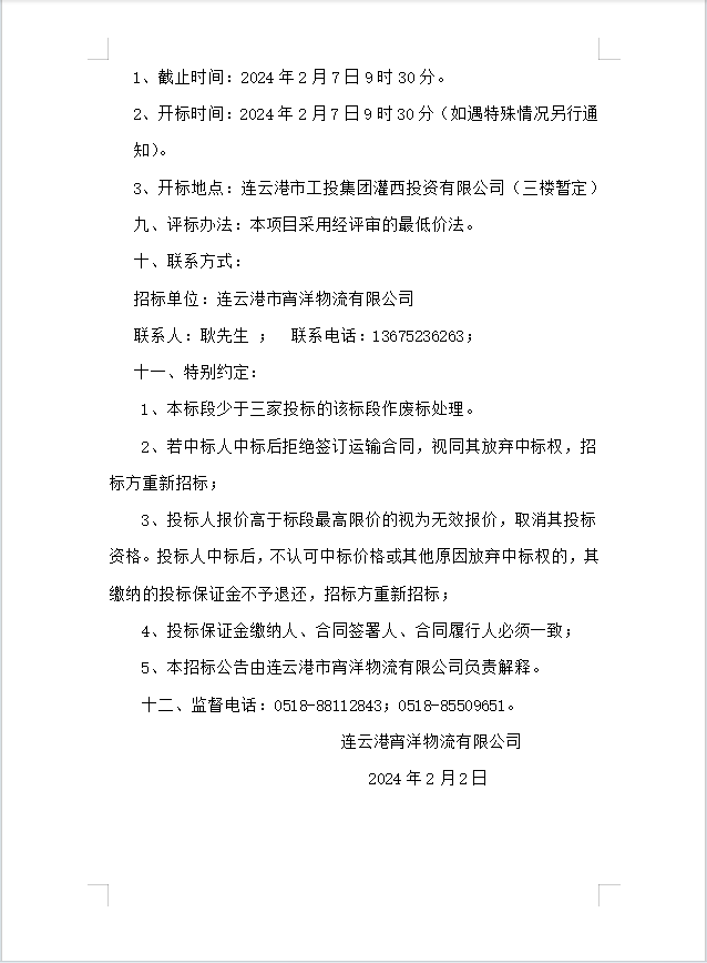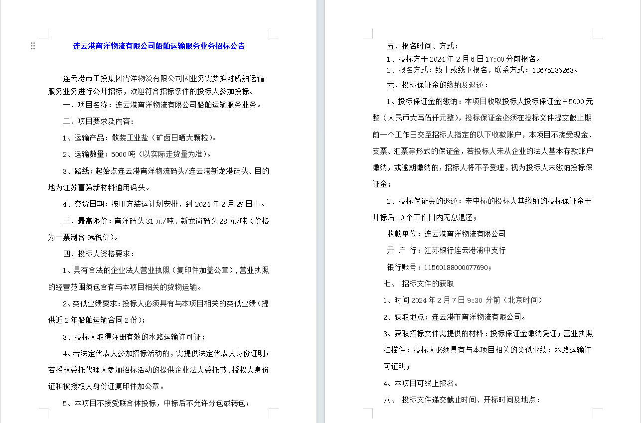 連云港宵洋物流有限公司船舶運輸服務(wù)業(yè)務(wù)招標公告