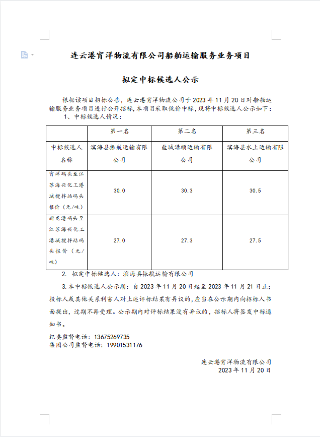 連云港宵洋物流有限公司船舶運輸服務(wù)業(yè)務(wù)項目擬定中標候選人公示