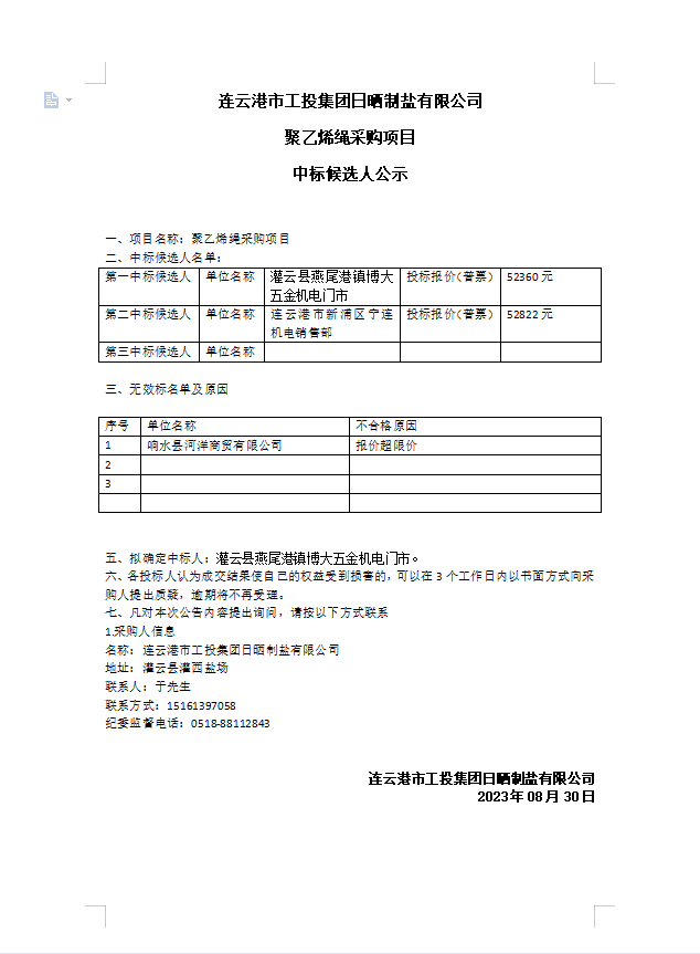 連云港市工投集團(tuán)日曬制鹽有限公司聚乙烯繩采購項目中標(biāo)候選人公示