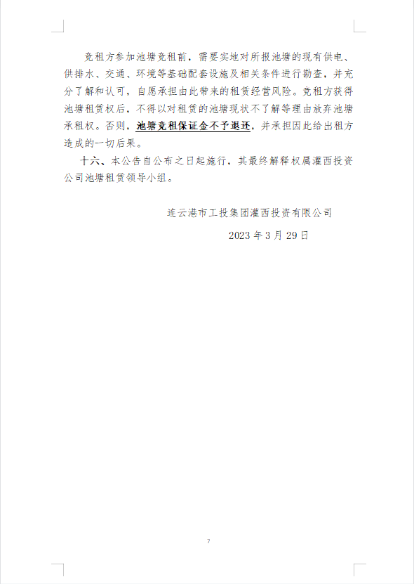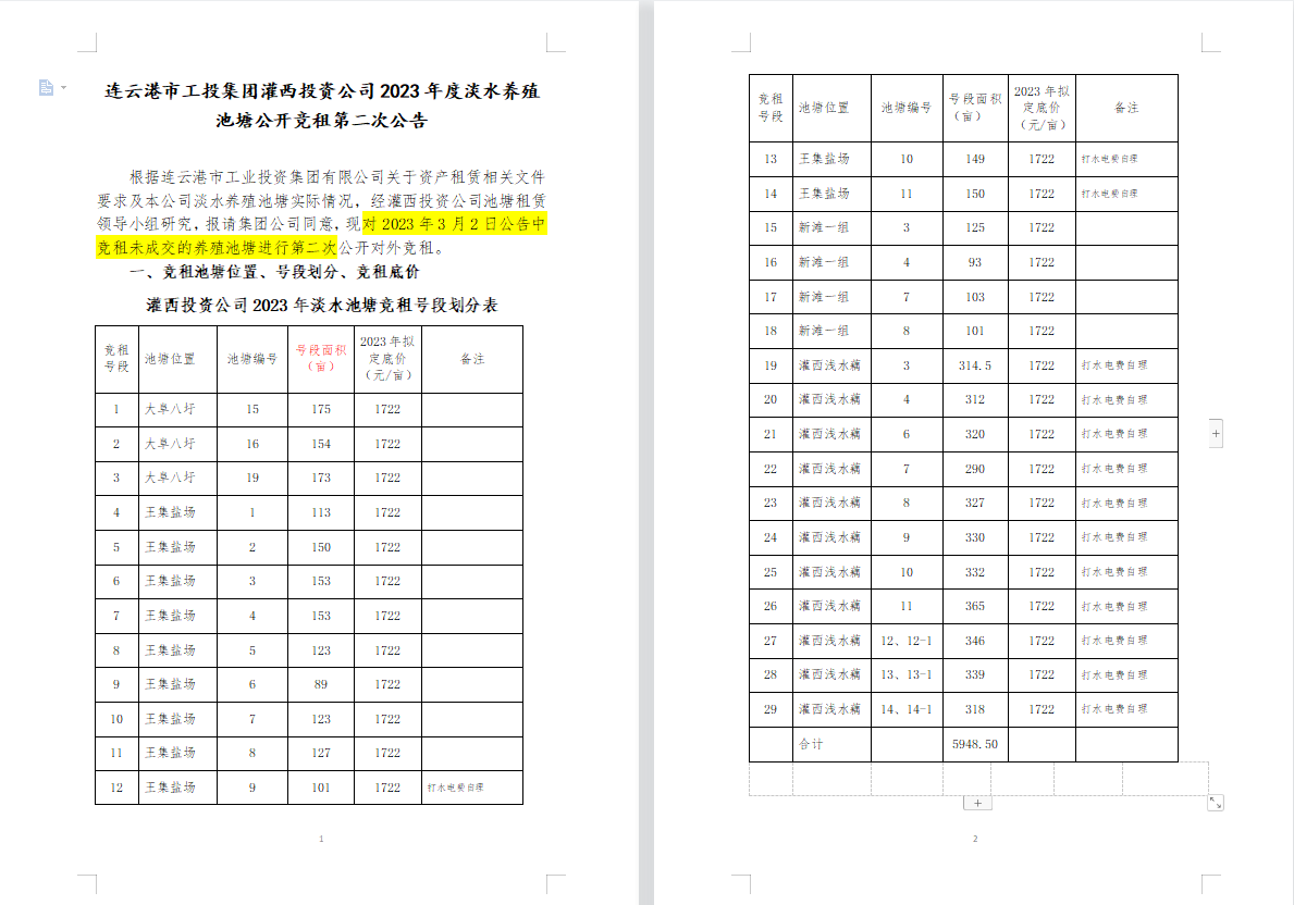 連云港市工投集團(tuán)灌西投資公司2023年度淡水養(yǎng)殖池塘公開(kāi)競(jìng)租第二次公告