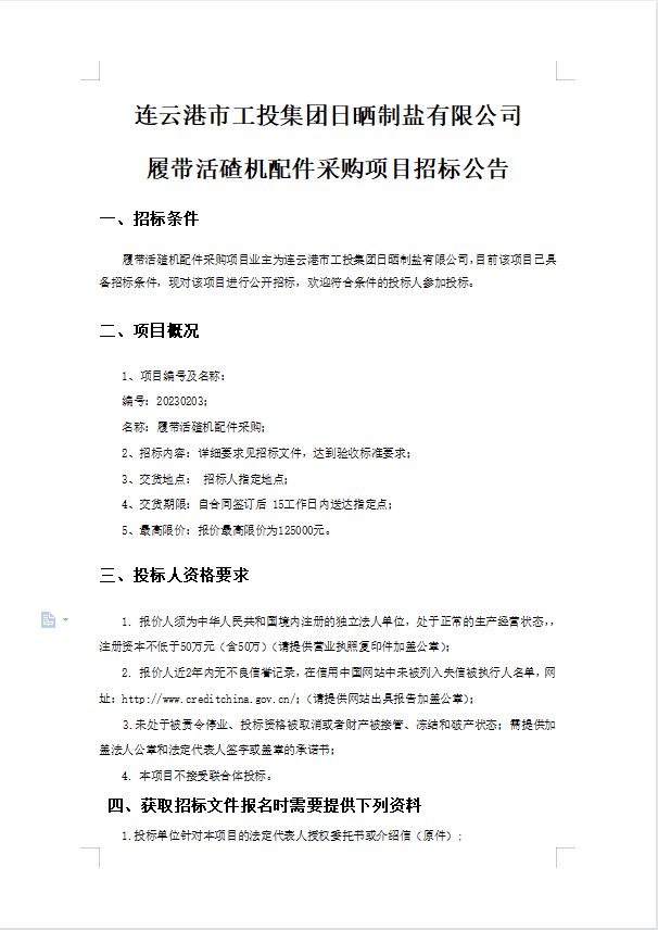 連云港市工投集團日曬制鹽有限公司履帶活碴機配件采購項目招標(biāo)公告