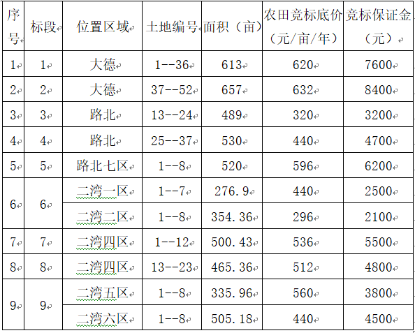 一、競(jìng)標(biāo)農(nóng)田標(biāo)段、位置、面積、競(jìng)標(biāo)底價(jià)、競(jìng)標(biāo)保證金: