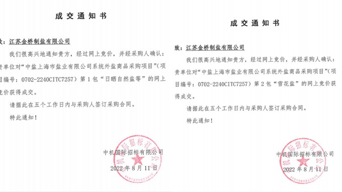 近日,我公司以網(wǎng)上競價的方式,成功中標(biāo)中鹽上海市鹽業(yè)有限公司系統(tǒng)外鹽商品2022-2023年度采購項目,標(biāo)的量1.5萬余噸。