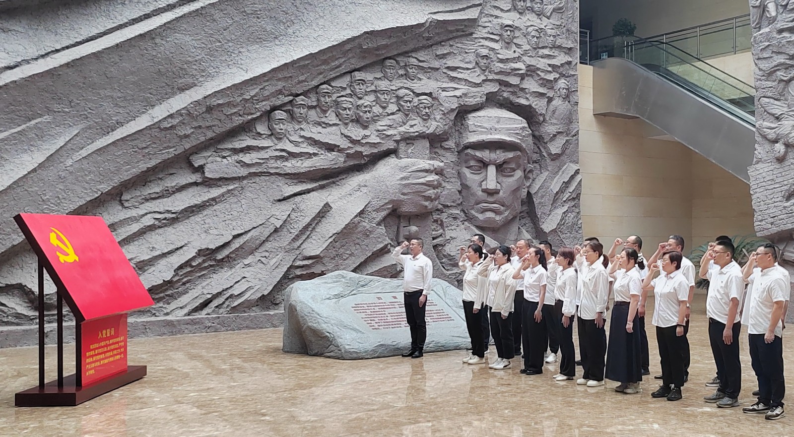 在連云港市革命博物館莊嚴(yán)肅穆的展廳內(nèi),大家認(rèn)真聆聽(tīng)講解員講述連云港地區(qū)的革命斗爭(zhēng)史。一件件珍貴的歷史文物、一幅幅生動(dòng)的歷史照片,再現(xiàn)了革命先烈們?yōu)槊褡褰夥攀聵I(yè)英勇奮斗的光輝歷程。在革命烈士浮雕前,全體黨員整齊列隊(duì),重溫入黨誓詞,強(qiáng)化政治信仰,增強(qiáng)責(zé)任擔(dān)當(dāng)。