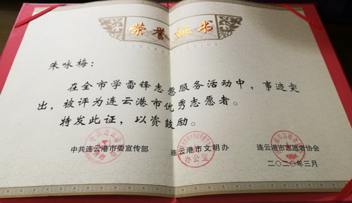 參加疫情防控志愿服務以來,朱詠梅一天都沒有休息,已為超過2萬名旅客檢測體溫。由于事跡突出,在全市學雷鋒志愿服務活動中,被評為連云港市優(yōu)秀志愿者。工作期間,渴了不敢喝水,餓了就吃泡面,雖然很辛苦,但是她覺得很自豪,她說:“我是一名預備黨員,也是一名國企職工,比起那些奮戰(zhàn)在疫情防控一線的醫(yī)務人員,我做的太少了;當前,全國人民都投入到新冠肺炎疫情防控工作中來,我只是為防控工作貢獻了自己的微薄的力量,我相信只要我們團結(jié)一心、眾志成城,就一定能早日戰(zhàn)勝疫情,早日打贏這場沒有硝煙的戰(zhàn)爭!(凌家佳)