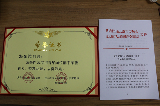孫佳忙同志喜獲市“青年崗位能手”稱號(hào)