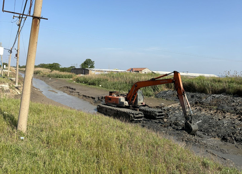三洋分場高效養(yǎng)殖基地,挖掘機正揮舞手臂,進行進排水渠疏浚作業(yè),為防汛做好前期準備工作,保障汛期安全穩(wěn)定。(青宣 田盛楠 史小?。?/span>
