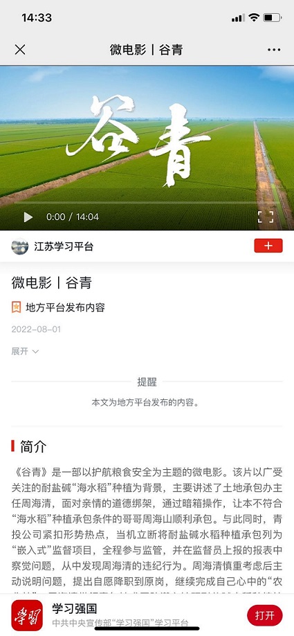 青口公司微電影《谷青》入選學(xué)習(xí)強(qiáng)國