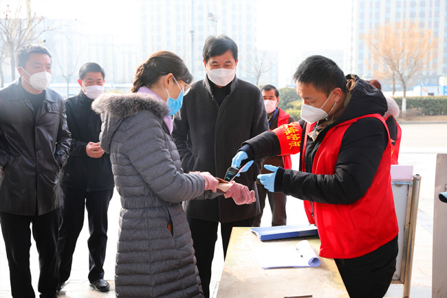 汪書記一行在公司疫情防控檢查站前,詳細(xì)了解了公司疫情防控情況,青農(nóng)一路作為主要的進(jìn)場通道,四個單位的黨員干部輪流值班,并設(shè)置臨時看護(hù)房,保證二十四小時值班。在鹽場家園小區(qū)僅保留一個出口,外來家用轎車一律禁止入內(nèi),每戶發(fā)一張通行證,嚴(yán)格管控人員流動。汪書記得知物業(yè)公司還沒有完成,鼓勵大家非常時期用非常辦法,將工作做細(xì)做實,想居民所想,嚴(yán)格做好防控工作。進(jìn)入小區(qū)前,汪書記也與居民一樣配合登記和測量體溫,當(dāng)看物業(yè)為了保證每天定時對單元和電梯間等重要場所的消毒存有大量消毒液,強調(diào)物業(yè)公司要增強消毒物品存放安全意識,合理使用,盡最大努力保一方平安。